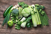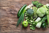 Zdjęcie "Widok z góry z świeżych sezonowych warzyw zielonych na drewnianym stole w kuchni" może być wykorzystywane do celów osobistych i komercyjnych zgodnie z warunkami zakupionej licencji Royalty-free. Obraz jest dostępny do pobrania w jakości wysokiej rozdzielczości do 5760x3840.