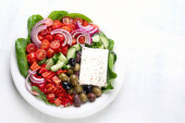 Widok z góry z sałatka grecka z fetą, ogórki, oliwki i pomidory na talerzu