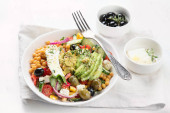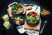 Widok z góry Sałatka z ciecierzycy, fetą i awokado, zdrowe jedzenie koncepcja