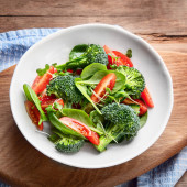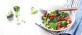 Widok z góry z miski z sałatką ze świeżych warzyw z brokułów i pomidorów