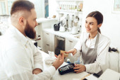 Uśmiechnięty mężczyzna barista daje dziewczyna jej zamówienia