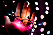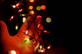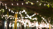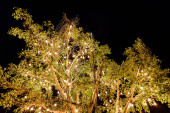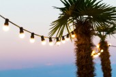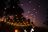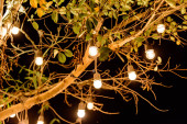 Żarówki, dekoracyjne odkryty, wiszące na drzewie w porze nocnej