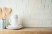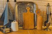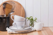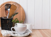 Naczynia kuchenne i akcesoria do gotowania stojąc na drewnianym stole