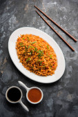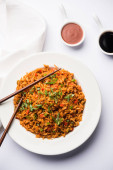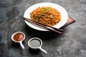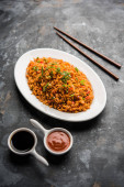 Zdjęcie "Schezwan smażony ryż Masala jest popularnym żywności indochińskiej serwowane w talerz lub miskę z pałeczkami. Selektywny fokus" może być wykorzystywane do celów osobistych i komercyjnych zgodnie z warunkami zakupionej licencji Royalty-free. Obraz jest dostępny do pobrania w jakości wysokiej rozdzielczości do 5760x3840.