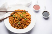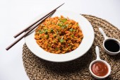 Schezwan smażony ryż Masala jest popularnym żywności indochińskiej serwowane w talerz lub miskę z pałeczkami. Selektywny fokus