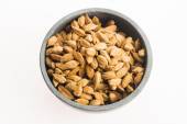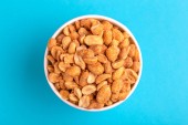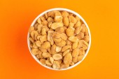 Prażone orzeszki ziemne w drewniane miski na jasnym tle marmurowych. Przekąski filmu. Miejsce