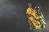 Zdjęcie "Grillowana pierś z kurczaka z pikantnymi sosami, pomidorów i ziół na ciemnym tle zardzewiały kopia miejsce widok z góry" może być wykorzystywane do celów osobistych i komercyjnych zgodnie z warunkami zakupionej licencji Royalty-free. Obraz jest dostępny do pobrania w jakości wysokiej rozdzielczości do 5760x3840.