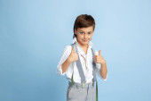 Pełna długość Portret słodkie małe dziecko w stylowe ubrania patrząc na kamery i uśmiechając się