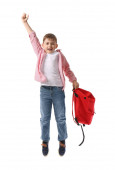 Pełna długość Portret słodkie małe dziecko w stylowe ubrania patrząc na kamery i uśmiechając się