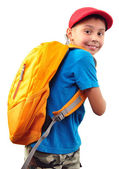 Pełna długość Portret słodkie małe dziecko w stylowe ubrania patrząc na kamery i uśmiechając się
