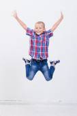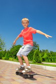 Portret uroczego chłopca jeżdżącego na deskorolce na białym tle