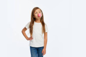 Zdjęcie "Pełna długość Portret słodkie małe dziecko w ubrania stylowe dżinsy, patrząc na kamery i uśmiechając się" może być wykorzystywane do celów osobistych i komercyjnych zgodnie z warunkami zakupionej licencji Royalty-free. Obraz jest dostępny do pobrania w jakości wysokiej rozdzielczości do 5760x3840.