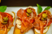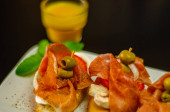 Owoce hiszpańskie tapas, mini Kanapki żywności zestaw, pyszne przekąski zakąska, obiad