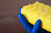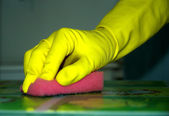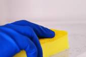 ręce w rękawiczkach gumowych czyszczenia powierzchni płytek ceramicznych, bezpieczne i higieniczne czyszczenie, utrzymanie czystości w domu