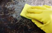 ręce w rękawiczkach gumowych czyszczenia powierzchni płytek ceramicznych, bezpieczne i higieniczne czyszczenie, utrzymanie czystości w domu