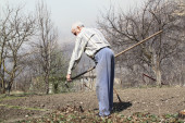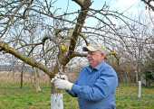 starszy mężczyzna patrzy na oddział kwitnienia morela