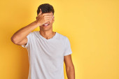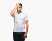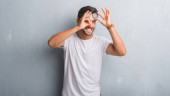 Zdjęcie "Młody przystojny mężczyzna na białym tle robi ok gest jak lornetki przyklejania się, język, oczy patrząc przez palce na sobie t-shirt biały dorywczo. Szalony wyrażenie." może być wykorzystywane do celów osobistych i komercyjnych zgodnie z warunkami zakupionej licencji Royalty-free. Obraz jest dostępny do pobrania w jakości wysokiej rozdzielczości do 5760x3840.