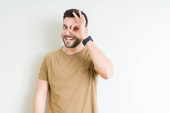 Młody przystojny mężczyzna na białym tle robi ok gest jak lornetki przyklejania się, język, oczy patrząc przez palce na sobie t-shirt biały dorywczo. Szalony wyrażenie.
