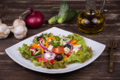 Sałatka Grecka z świeżych pomidorów, ogórków, czerwona cebula, bazylia, ser feta, oliwki czarne i ziół włoskich