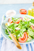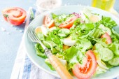 Zdjęcie "Źródlana detox wymieszać Sałatka z warzywami (ogórek, cytryny, pomidor, rukolą i szpinaku), na lekki klaps, kamienne lub betonowe podłoże. Widok z góry miejsce" może być wykorzystywane do celów osobistych i komercyjnych zgodnie z warunkami zakupionej licencji Royalty-free. Obraz jest dostępny do pobrania w jakości wysokiej rozdzielczości do 5760x3840.