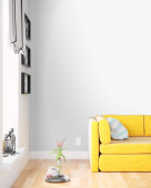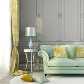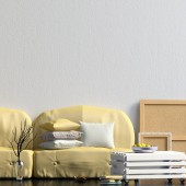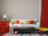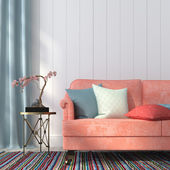 niebieska sofa z kolorowe poduszki i biały stolik kawowy