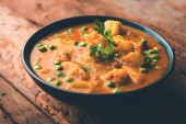 Zdjęcie "Indyjskich żywności - Aloo curry masala. Ziemniaki gotowane z przypraw i ziół w pomidorowym curry. w misce serwowane na tle moody. Selektywny fokus" może być wykorzystywane do celów osobistych i komercyjnych zgodnie z warunkami zakupionej licencji Royalty-free. Obraz jest dostępny do pobrania w jakości wysokiej rozdzielczości do 5760x3840.