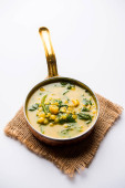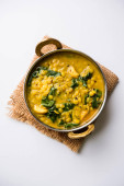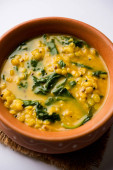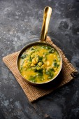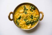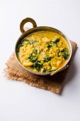 Dal Palak lub soczewicy szpinak curry - przepis zdrowe popularne indyjskie danie główne. serwowane w karahi/patelni lub miski. Selektywny fokus