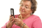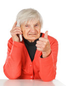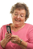 uśmiechający się włos starszy za pomocą telefonów komórkowych na biały