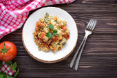 W domu omlet z grzybami i rukolą na podłoże drewniane