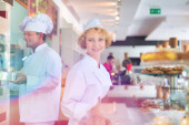 Uśmiechnięta młoda kelnerka serwujemy świeże pieczywo w restauracji