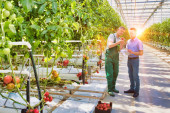 Zdjęcie "Rolnicy dyskusji podczas spaceru wśród roślin w szklarni" może być wykorzystywane do celów osobistych i komercyjnych zgodnie z warunkami zakupionej licencji Royalty-free. Obraz jest dostępny do pobrania w jakości wysokiej rozdzielczości do 5760x3840.