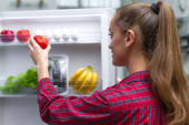 Zdjęcie "Gospodyni kładzie pomidory w lodówce. Przechowywanie żywności w lodówce. Prawidłowego i zdrowego jedzenia. Świeżej żywności i warzywa" może być wykorzystywane do celów osobistych i komercyjnych zgodnie z warunkami zakupionej licencji Royalty-free. Obraz jest dostępny do pobrania w jakości wysokiej rozdzielczości do 5760x3840.
