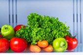 Gospodyni kładzie pomidory w lodówce. Przechowywanie żywności w lodówce. Prawidłowego i zdrowego jedzenia. Świeżej żywności i warzywa