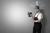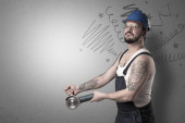 Zdjęcie "Złota rączka z narzędziem w ręku i ręcznie rysowane linie powyżej." może być wykorzystywane do celów osobistych i komercyjnych zgodnie z warunkami zakupionej licencji Royalty-free. Obraz jest dostępny do pobrania w jakości wysokiej rozdzielczości do 5760x3840.