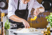 Zbliżenie zdjęcie baker pękanie jajka do ciasta. Zdjęcia w stylu retro.