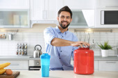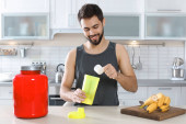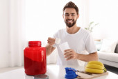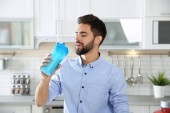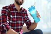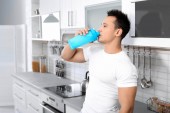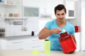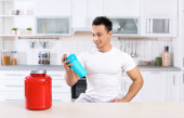 Młody mężczyzna, trzymając butelkę shake białka w kuchni. Miejsca na tekst