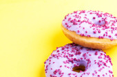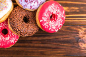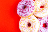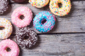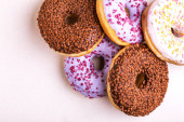 Inne pyszne pączki na jasne zielone tło. Niezdrowe, ale pyszne słodycze. Miejsce