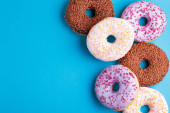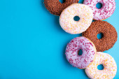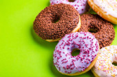 Zdjęcie "Inne pyszne pączki na jasne zielone tło. Niezdrowe, ale pyszne słodycze. Miejsce" może być wykorzystywane do celów osobistych i komercyjnych zgodnie z warunkami zakupionej licencji Royalty-free. Obraz jest dostępny do pobrania w jakości wysokiej rozdzielczości do 5760x3840.
