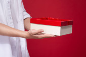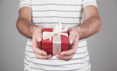 opakowania yound człowieka na szarym tle czerwony dar w rękach