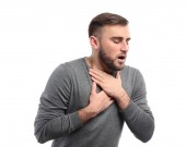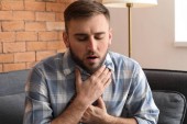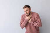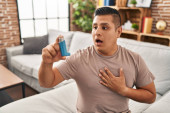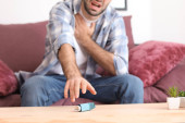 Młody człowiek z atak astmy, biorąc inhalator z tabeli