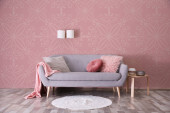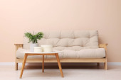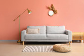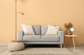Zdjęcie "Prosty salon wnętrza z Nowoczesna sofa w pobliżu kolor ściany. Miejsca na tekst" może być wykorzystywane do celów osobistych i komercyjnych zgodnie z warunkami zakupionej licencji Royalty-free. Obraz jest dostępny do pobrania w jakości wysokiej rozdzielczości do 5760x3840.