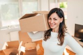 Młoda kobieta noszenia wewnątrz pudełka tekturowe. Uśmiechając się i patrząc na kamery.