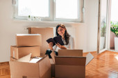 Zdjęcie "Młoda kobieta noszenia wewnątrz pudełka tekturowe. Uśmiechając się i patrząc na kamery." może być wykorzystywane do celów osobistych i komercyjnych zgodnie z warunkami zakupionej licencji Royalty-free. Obraz jest dostępny do pobrania w jakości wysokiej rozdzielczości do 5760x3840.