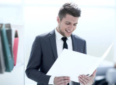 Uśmiechający się biznesmen czytanie niektórych dokumentów w miejscu pracy