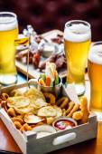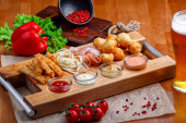 Zdjęcie "Duży zbiór Transportery wstążkowy obejmuje smażone kulki serowe, Warkoczyki sera, szynki i Krab kije podawane z sosami czosnek, keczup i musztarda na desce i brązowym tle." może być wykorzystywane do celów osobistych i komercyjnych zgodnie z warunkami zakupionej licencji Royalty-free. Obraz jest dostępny do pobrania w jakości wysokiej rozdzielczości do 5760x3840.