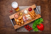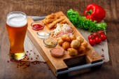 Duży zbiór Transportery wstążkowy obejmuje smażone kulki serowe, Warkoczyki sera, szynki i Krab kije podawane z sosami czosnek, keczup i musztarda na desce i brązowym tle.