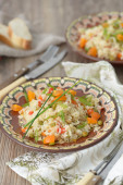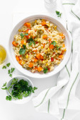 Kasza gotowana marchew, zielonego groszku i kukurydzy, dieta wegańska zdrowy