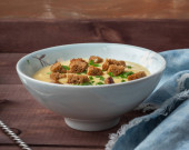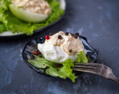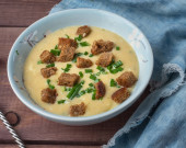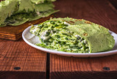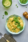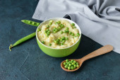 Płyta z puree z ziemniaków i zielonego groszku na serwetce niebieski denim. Strzał na ciemnym tle, widelec jest stojący obok niego.