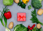 Zawijanie piękne tulipany w pobliżu pudełko na drewnianym stole