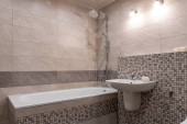 Wnętrze nowoczesne łazienki z wanną, prysznicem i toaletą